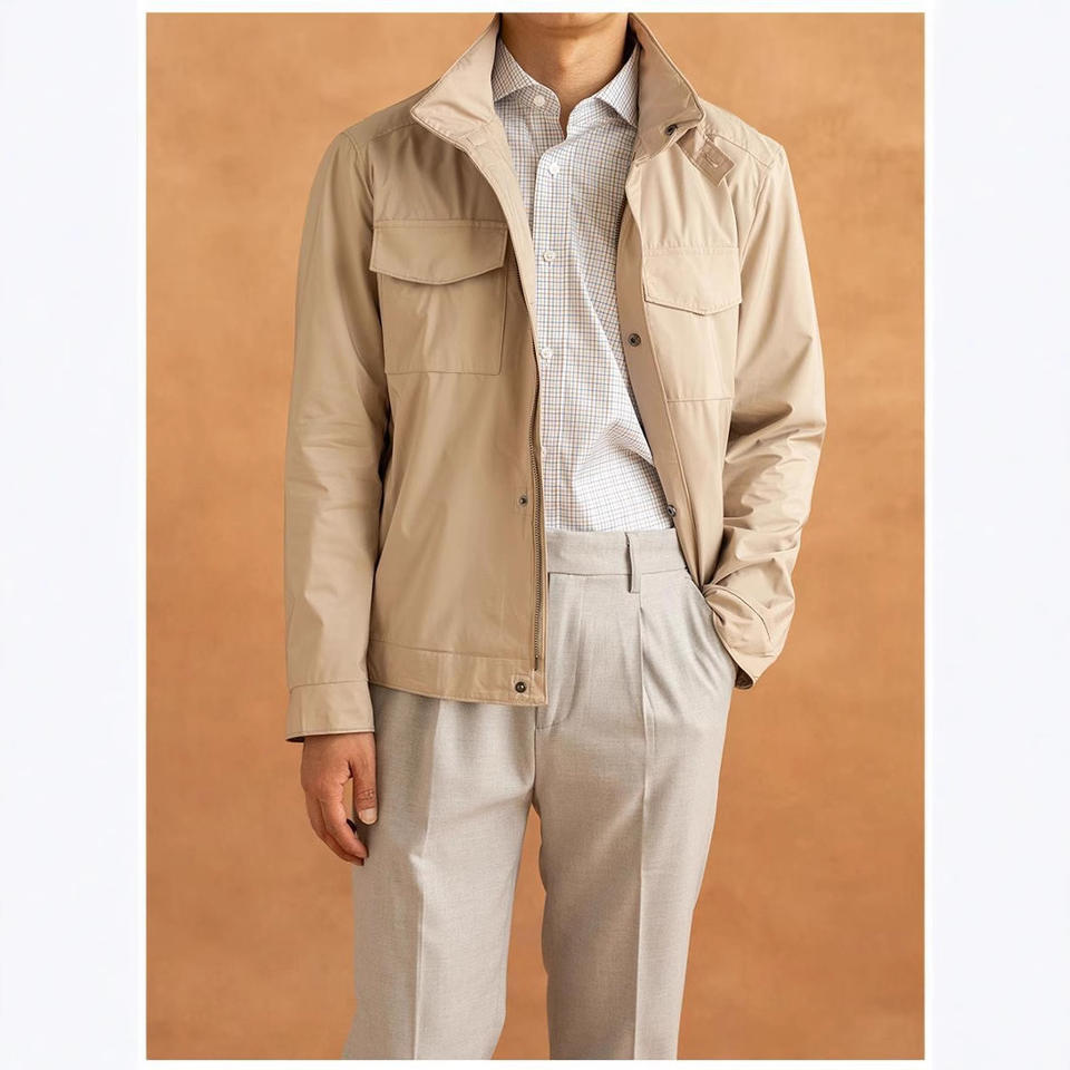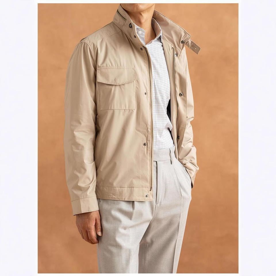 Men's Casual Canvas Windbreaker Jacket with Autumn Stand Collar Front Logo Outdoor Waterproof Zipper