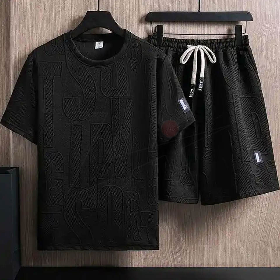 Men's Casual Heavy Jacquard T-Shirt Shorts Set Loose Fit Plus Size Summer Two-Piece Outfit for Men Trendy Streetwear