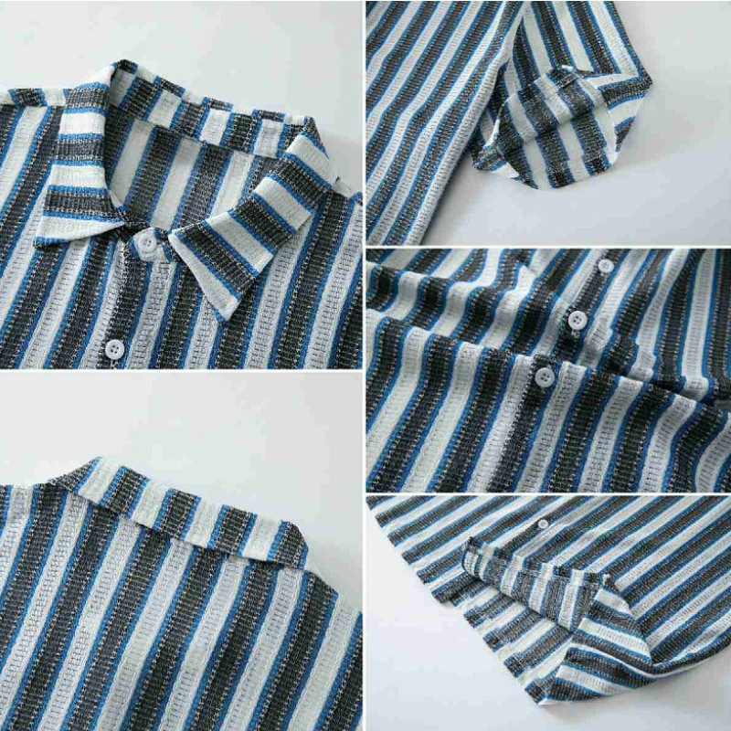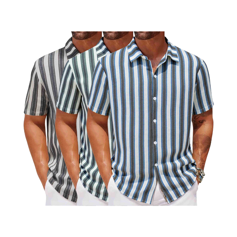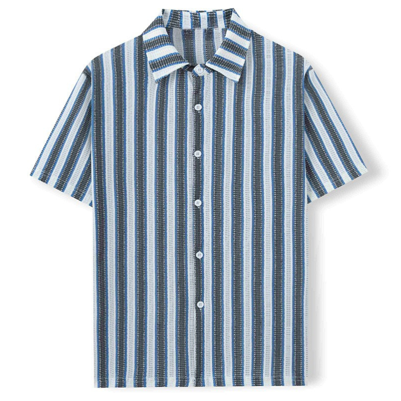 Men's Casual Lightweight Cotton Shirt Short Sleeve Embroidered Button Loose Fit Knitted Blank with Striped Design