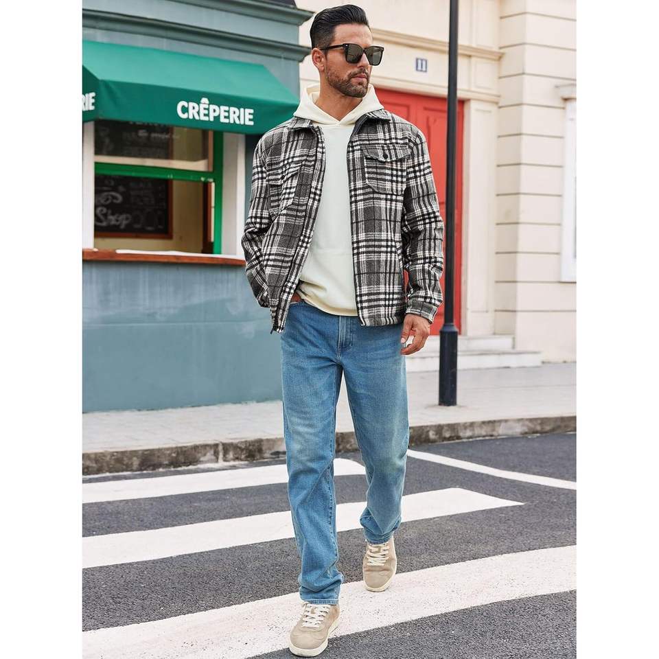 Men's Casual Long Sleeve Flannel Coat Fall Winter Outwear Sherpa Lining Zip-Up Buffalo Plaid XS Size Plain Dyed Fleece Jacket