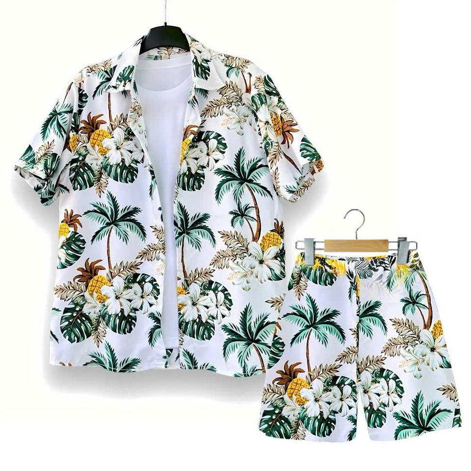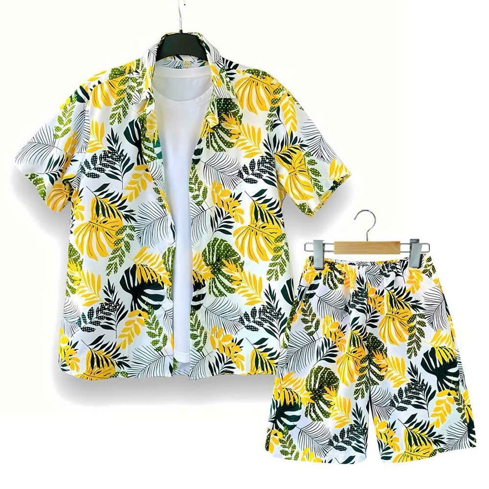 Men's Casual Summer Woven T-Shirt Tropical Leaf Print Solid Pattern Colorful Short Length Front for Beachwear & Family Outings
