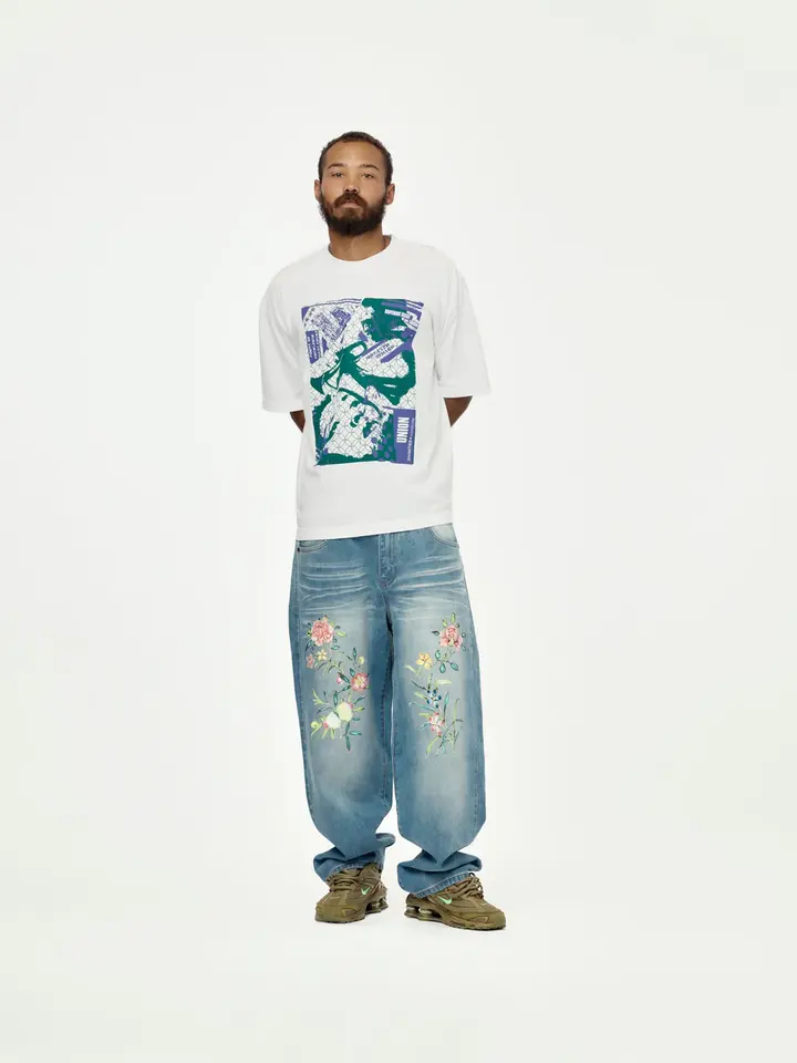 Men's Chinese Style Floral Embroidered Wide-Leg Drawstring Waist Casual Pants Paisley and Animal Pattern Baggy Jeans