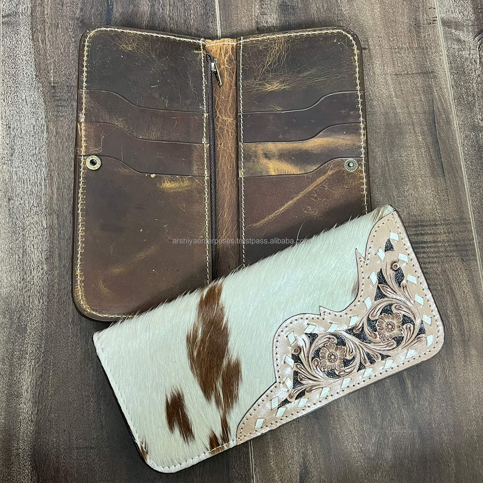Genuine Hand Tooled Cowhide Leather Bifold Long Wallet