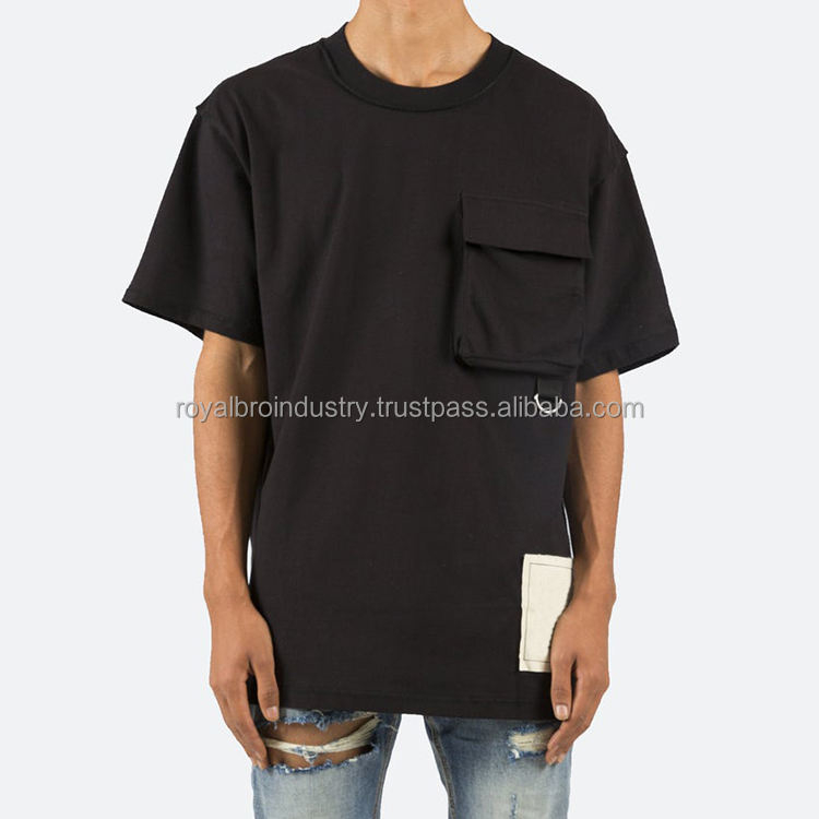 Men's Custom Cotton T-Shirt with Square Box Cargo Pocket Knitted Patch Work and Plain Dyed Technique New Design