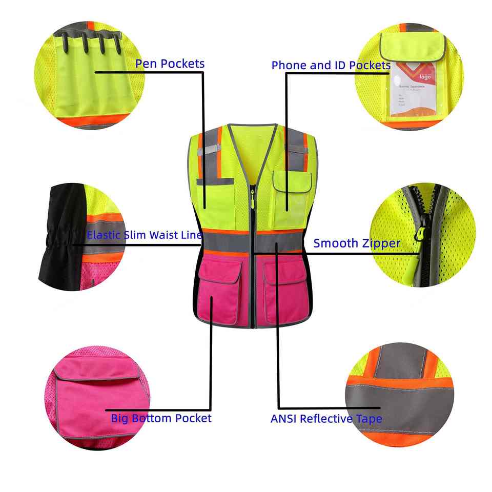 Men's Custom Logo Hi Vis Security Jacket Polyester Cotton Multi-Pockets Mesh Zipper Fluorescent Reflective Vest Safety Clothing