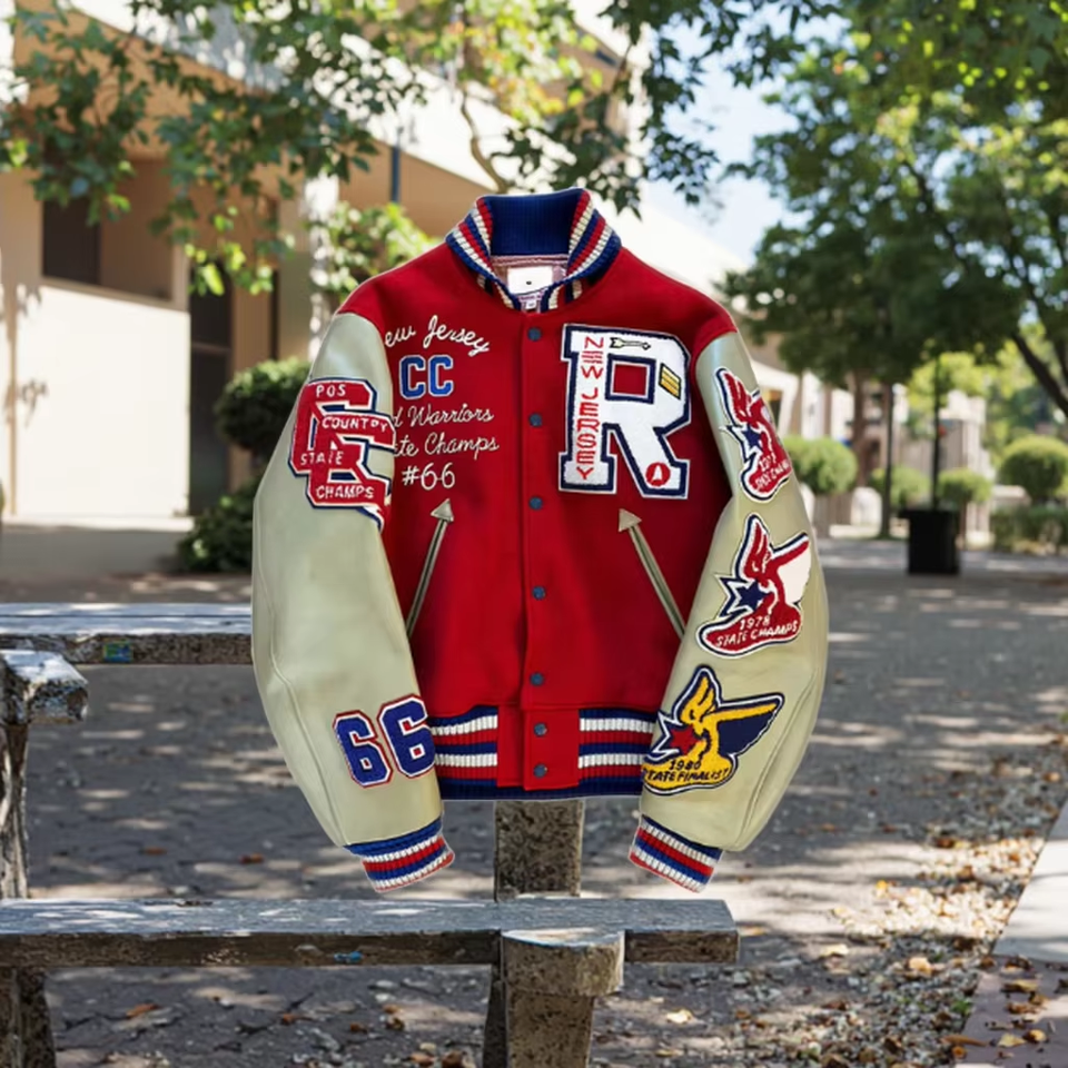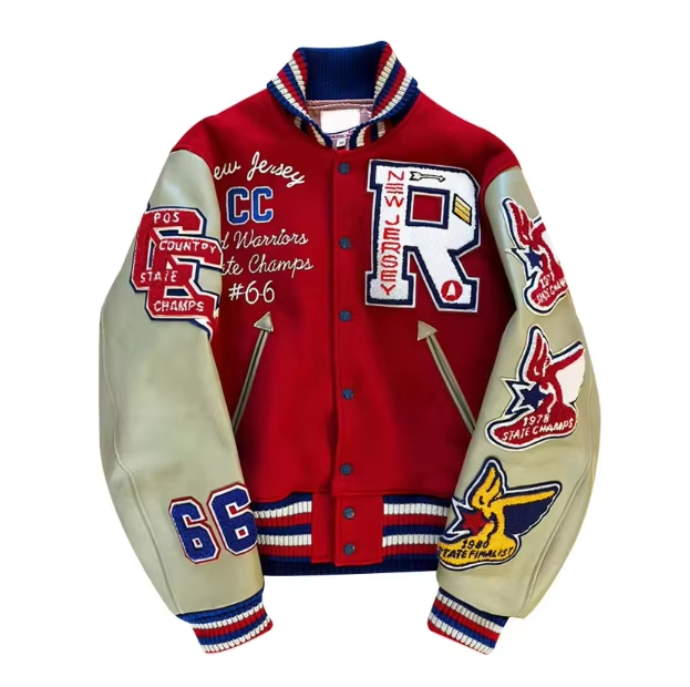 Men's Custom Vintage Wool Sleeve Puffer Jacket with Wool Embroidery Stand Collar Canvas Fabric Waterproof & Breathable