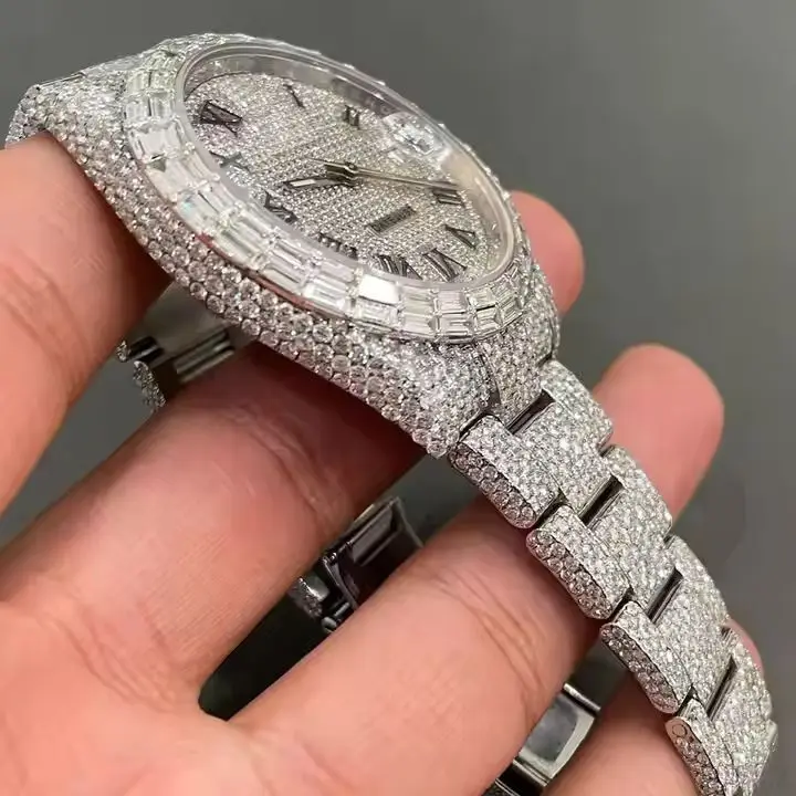 Men's Custom moissanite Watch Round Cut Baguette Diamond Hip Hop Style Steel Case Glass Dial Watch Passed with tester