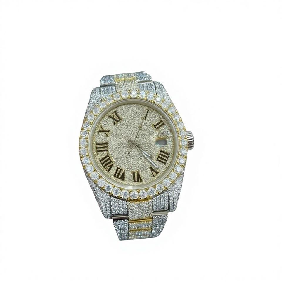 Men's Dial Quartz Watch with Two-Tone Yellow Gold Round Moissanite & Stainless Steel Case Glass 10 Bar Bracelet Clasp Gift