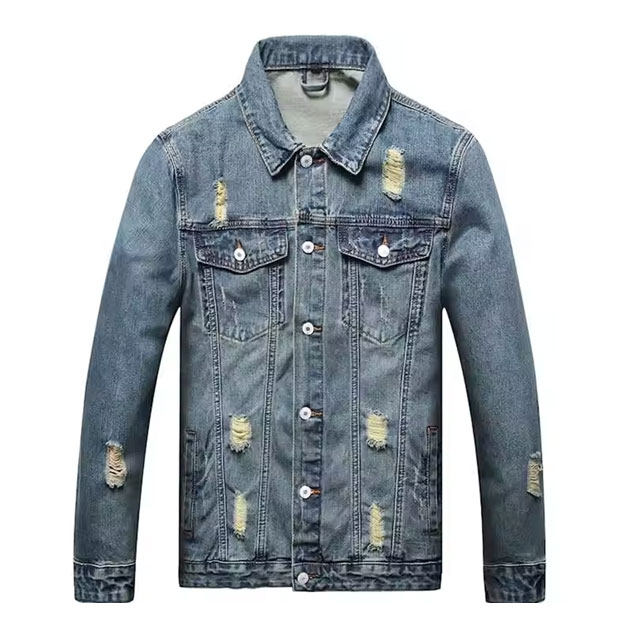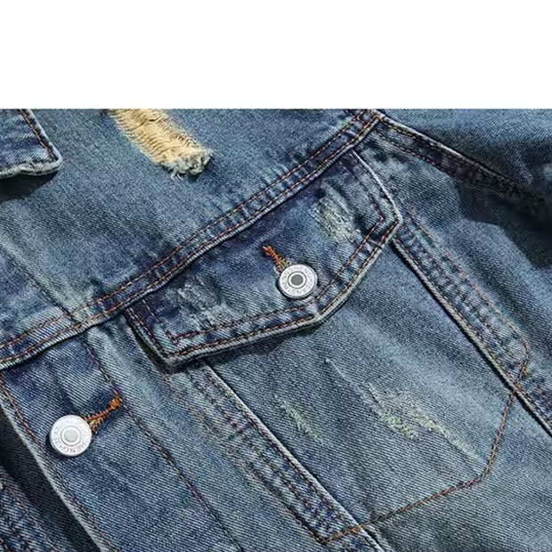 Men's Distressed Vintage Denim Jacket Slim Fit Trucker Jean Winter Outdoor Wear with Ripped Streetwear Print Button Decoration