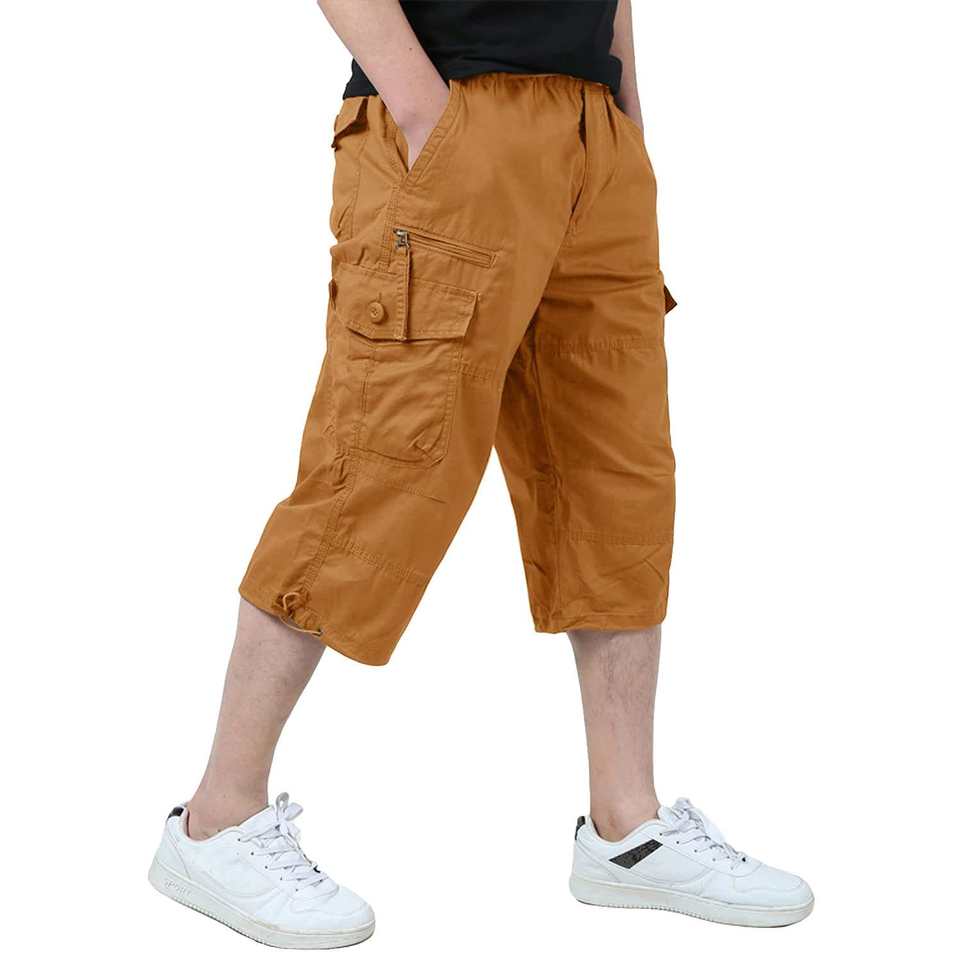Men's Elastic Cargo Shorts Athletic Running Hiking Drawstring Multi Pockets Knee Workout Capri Long Waterproof Breathable Solid