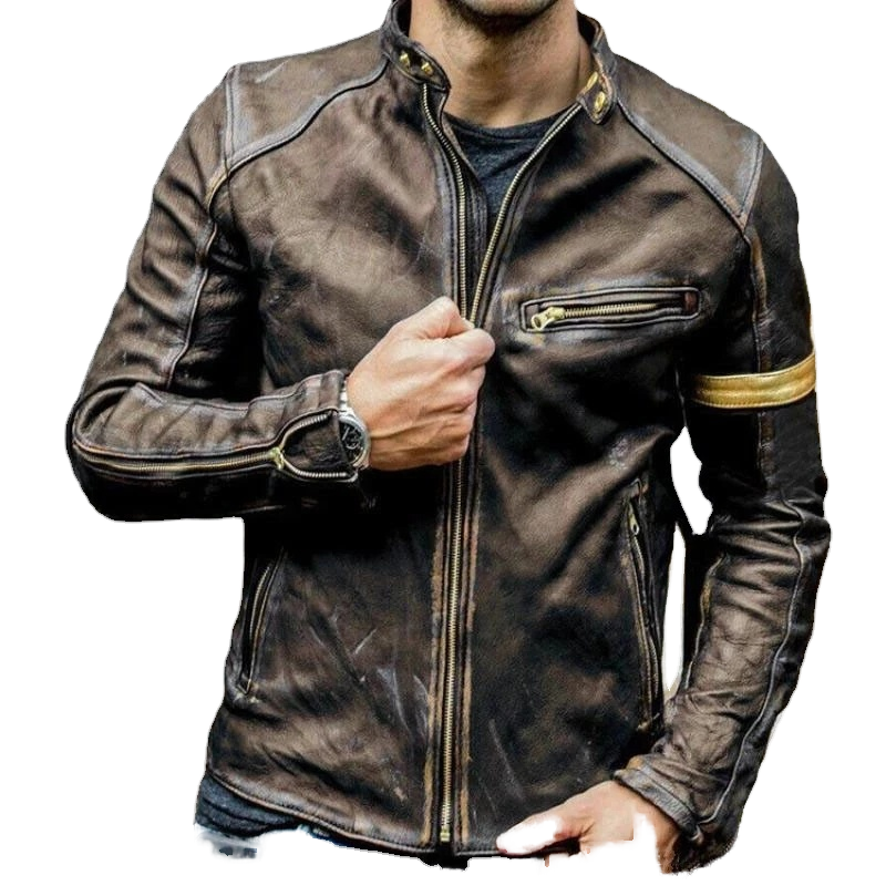 Men's Fashion Casual Punk Genuine Leather Jacket Autumn Windproof Eco-Friendly Turn-down Collar Canvas Fabric Zipper Front