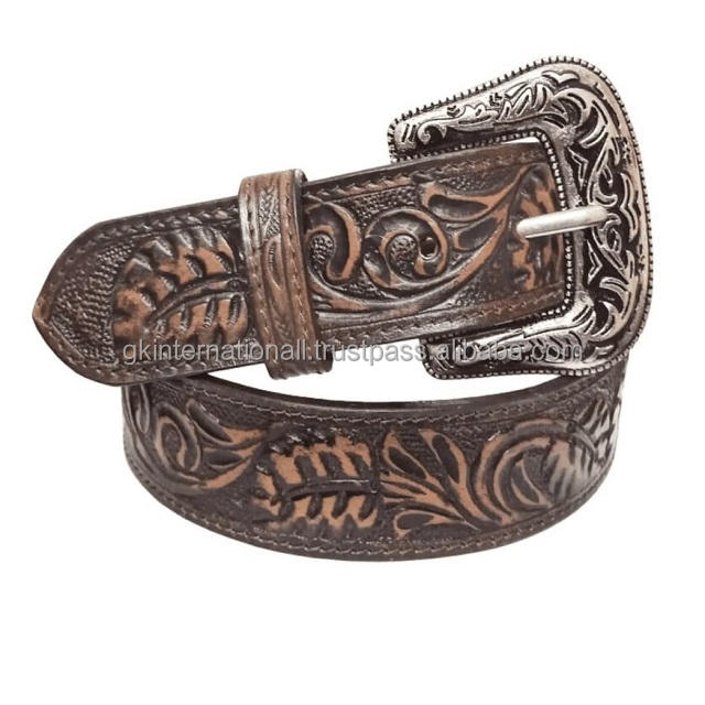 Men's Fashion Floral Engraved Brown Western Leather Tooling Belt for Men and Women With Designer Floral Pin Buckle Custom Sizes