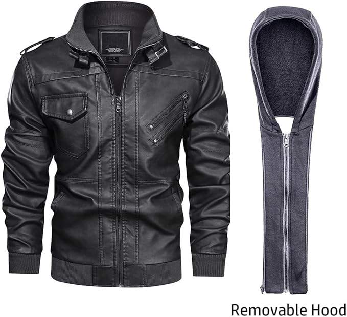 Men's Faux Leather Jacket Casual Brown Motorcycle Jacket with Removable Hood