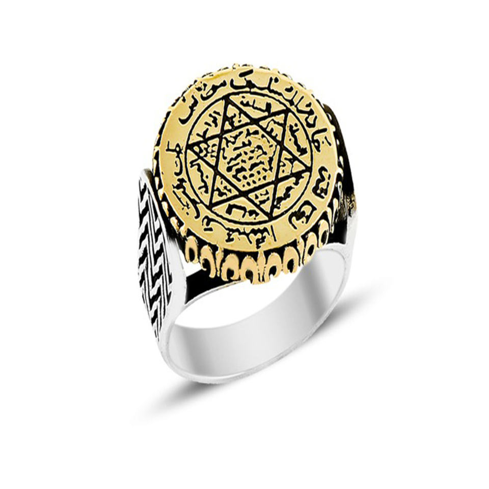 Men's Gold Plated Seljuk Motif Ring, Mystical and Impressive Design, 925 Sterling Silver, 14g