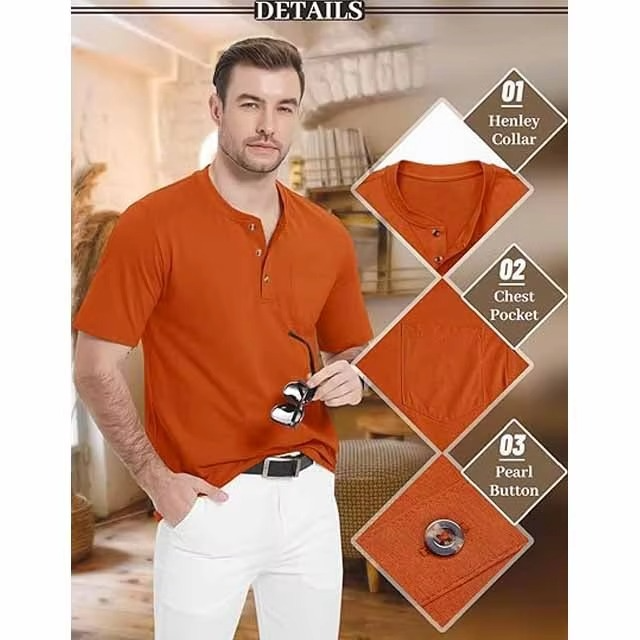 Men's Henley Shirts Short Sleeve Pocket Tee Shirts Cotton Casual T-Shirts Vintage Plain Shirts Summer Fashion