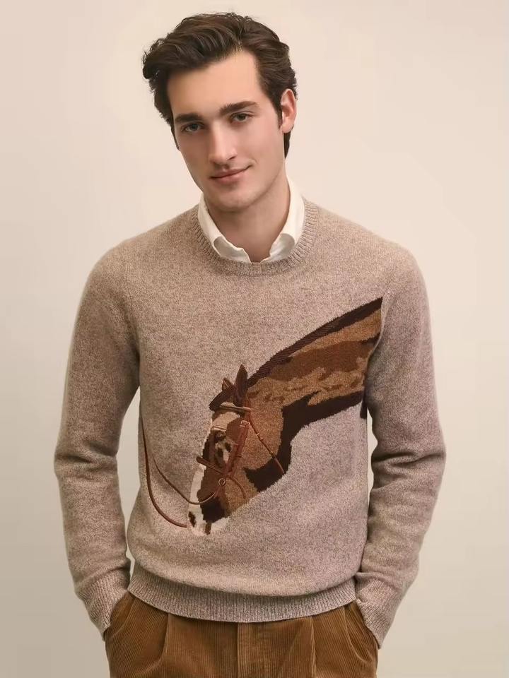 Men's Intarsia Horse Graphic Sweater Wool Cashmere Blend Long Sleeve Crew Neck Pullover Jumper Beige
