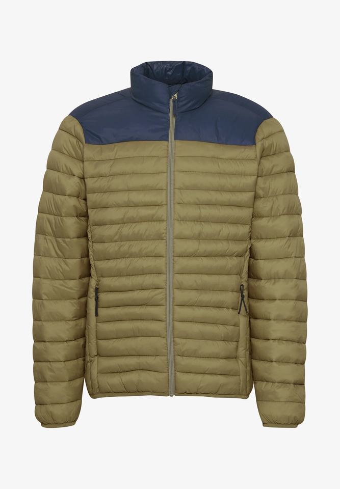 Men's Lightweight Hooded Olive Green Puffer Jacket Navy Shoulder Panels Quilted Waterproof Windproof Zip Front Warm Winter