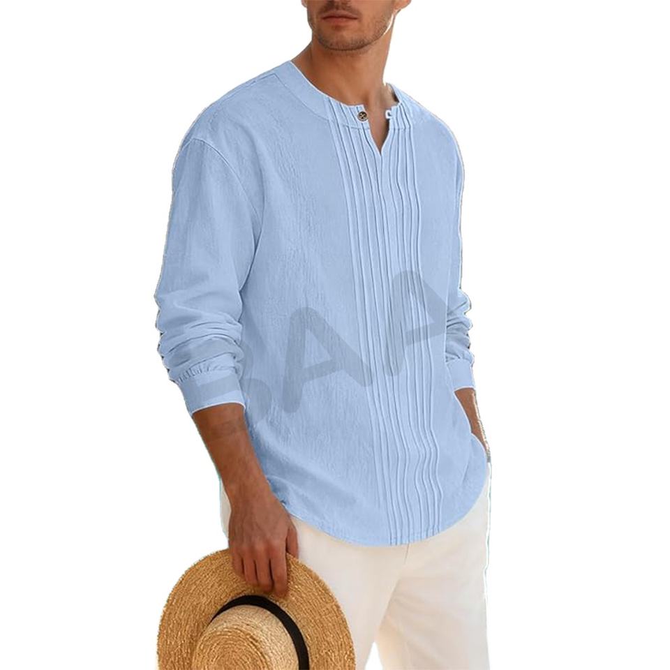 Men's Linen Shirts Casual Long Sleeve Pleated Front T-Shirt Button Henley Collared Loose Lightweight Pullover Top