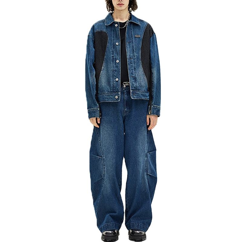 Men's Long Sleeve Denim Jacket Custom Logo Color Blocking Loose Blue Jean Stone Washed Denim Patchwork Jean Jacket for Men