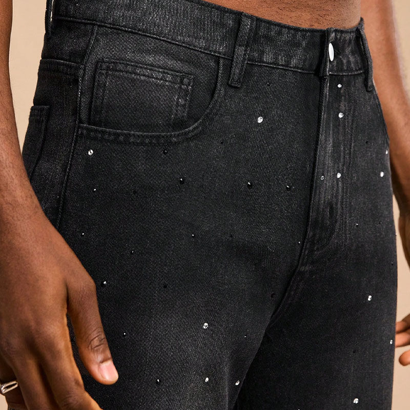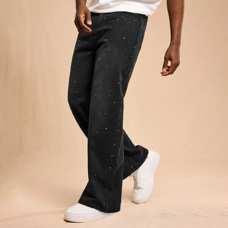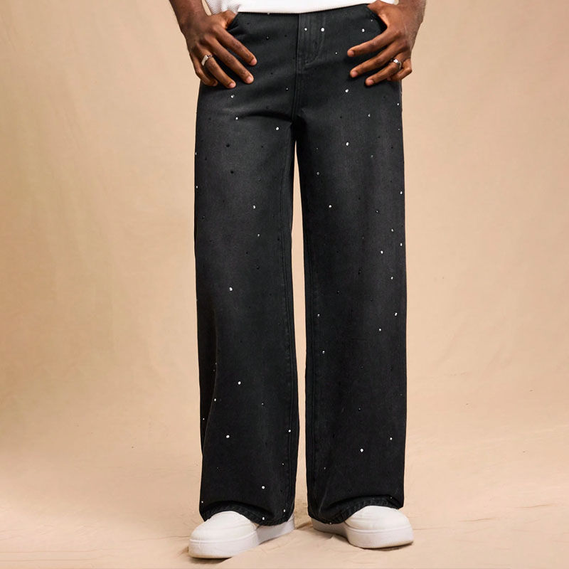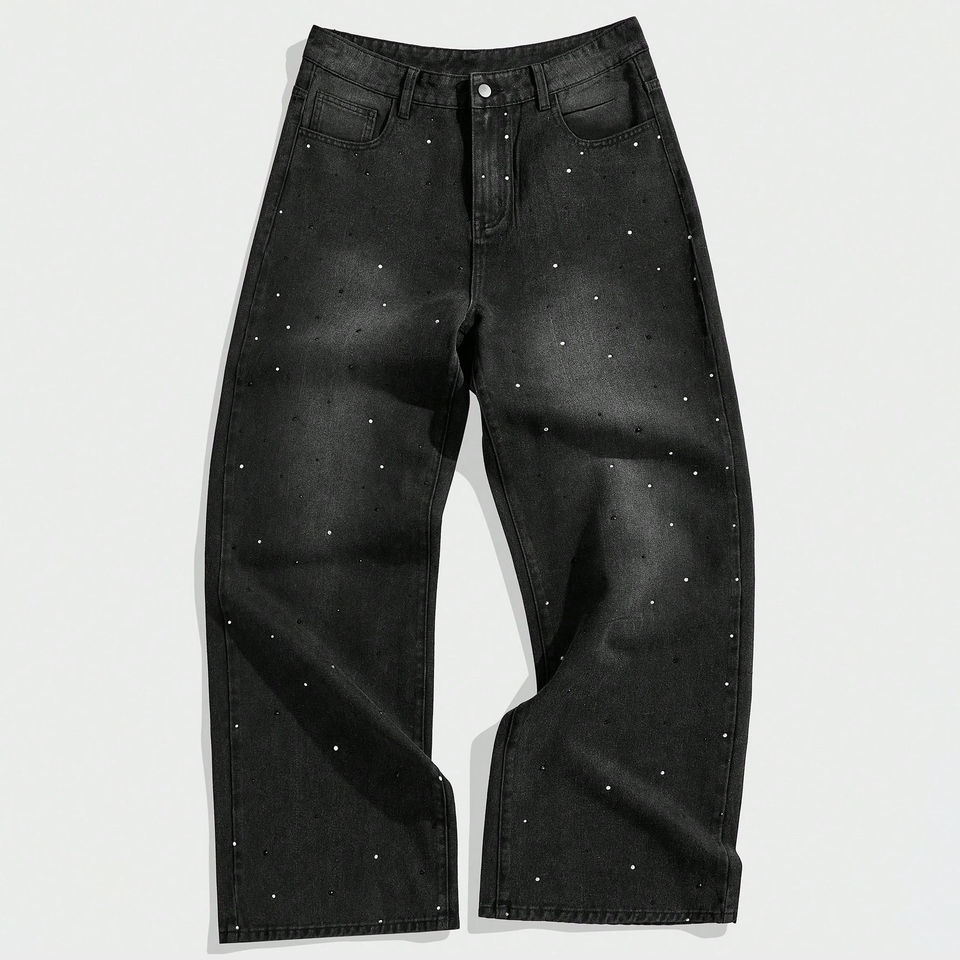 Men's Loose Fitting Rhinestone Embellished Dark Grey Washed Jeans Men Party Clothes Streetpants