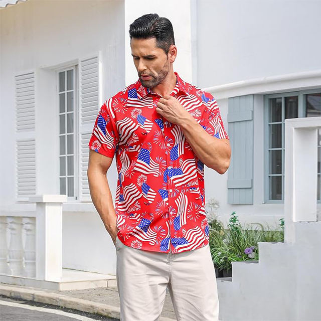 Men's Loose Short Sleeve Hawaiian Shirt with Stand Collar Breathable Beach Resort Casual Prints Customizable Logo ODM Supply