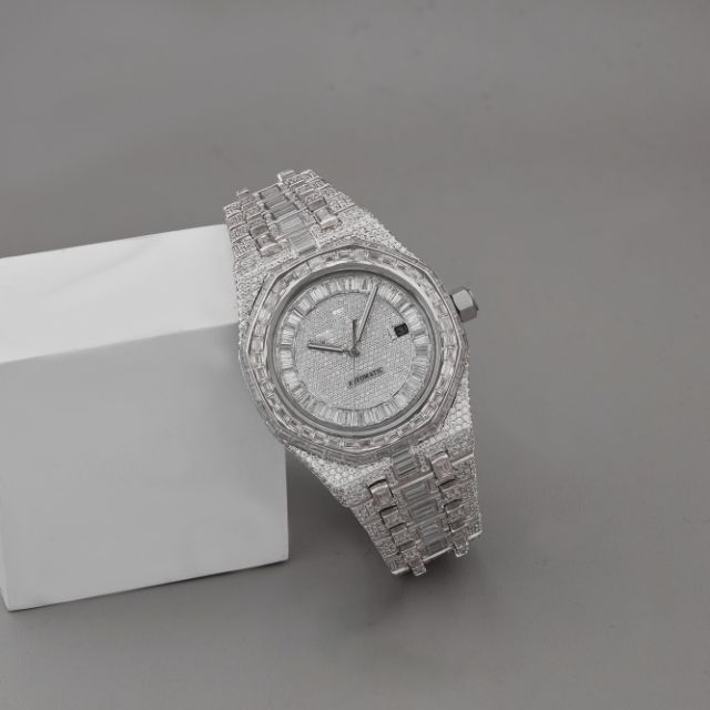 Men's Luxury Blinged Out Silver Watch with Baguette Diamond Style Bezel and Date Display Fashionable Crystal Dial Window Design