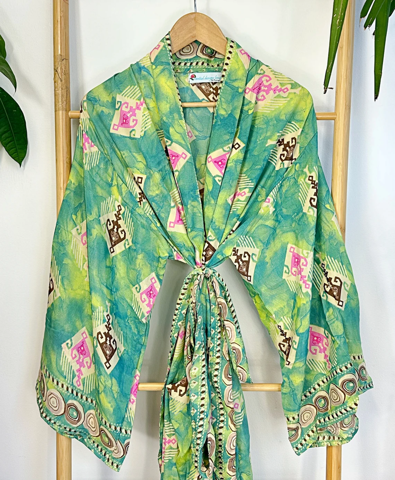 Men's Luxury Boho Kimono Haori Silky Blend Dressing Robe in Green Lime Aqua Long Casual Summer Beach Artist House Style