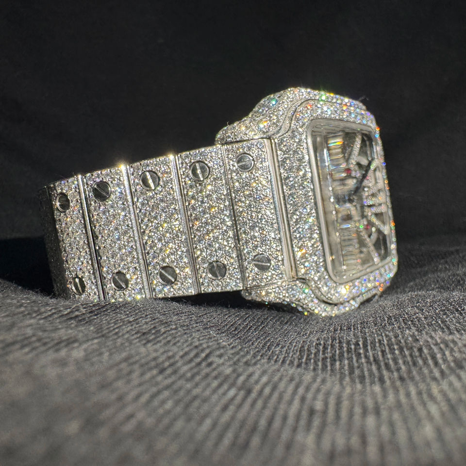 Men's Luxury Square Crystal Iced Moissanite Quartz Watch with Stainless Steel Band and Skeleton Design
