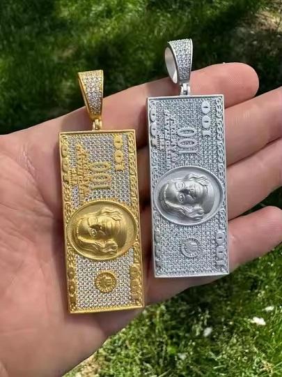 Men's MOISSANITE Solid 925 Sterling Silver Iced Hundred Dollar Bill Benjamins Money Pendant Hip Hop, PASSES DIAMOND Tester!!!