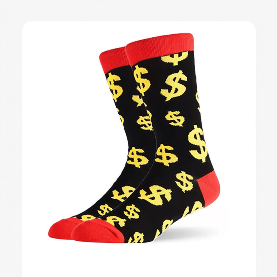 Men's Mid-Calf Socks 40-45 Black Yellow Dollar Sign Pattern Red Trim Casual Fashion Socks