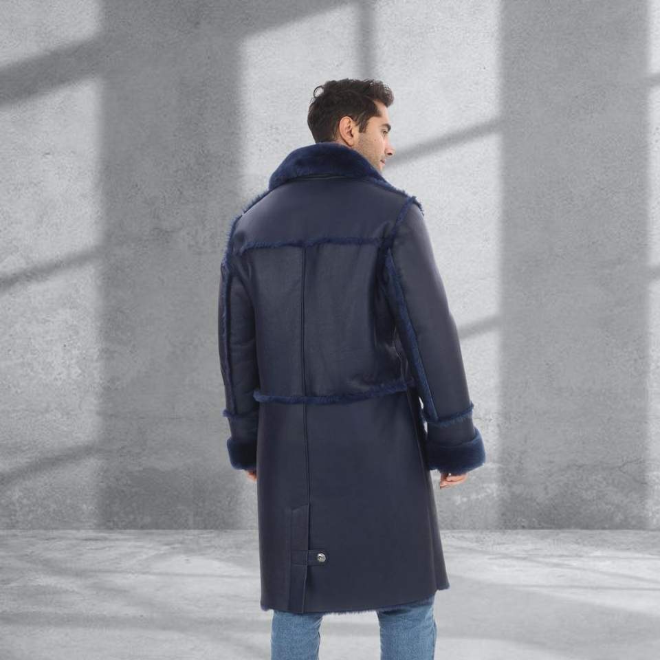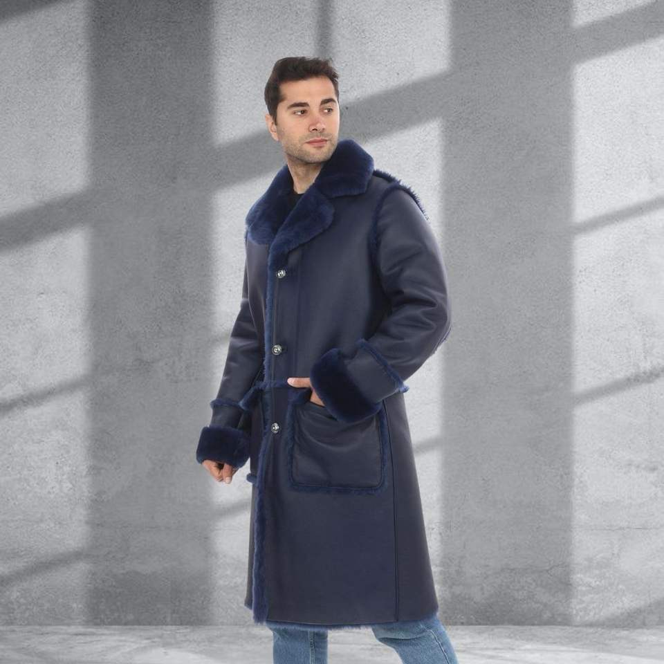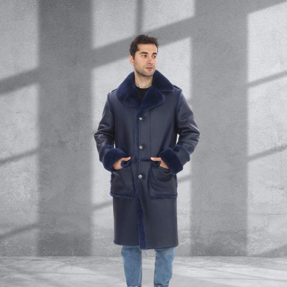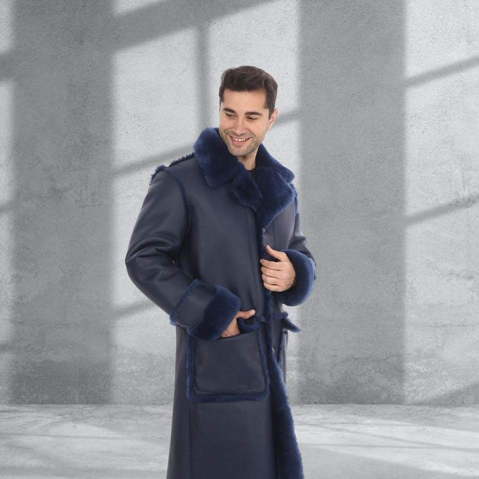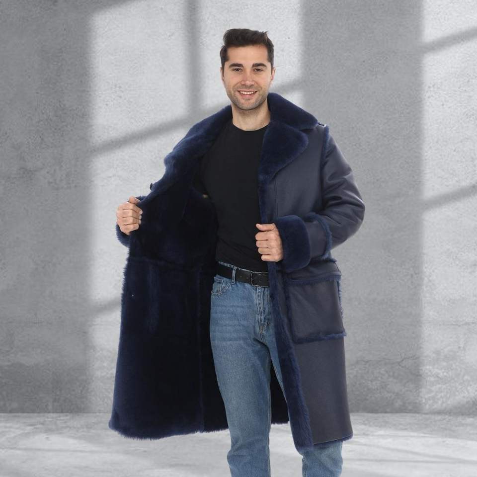 Men's Navy Blue Shearling Long Coat 100% Genuine Sheepskin Handmade OEM/Wholesale Turkey Deeply Sophisticated Winter Overcoat