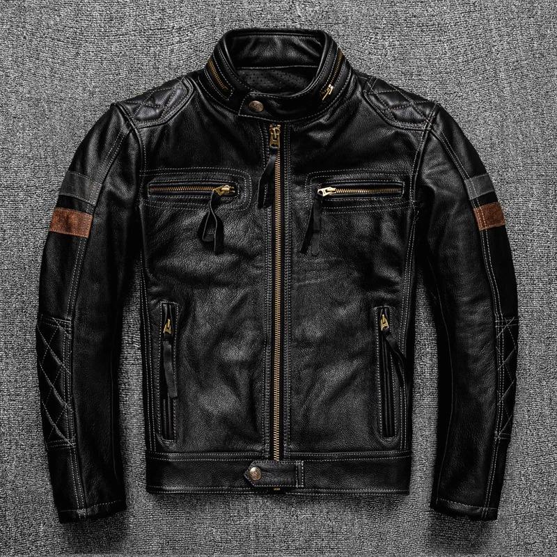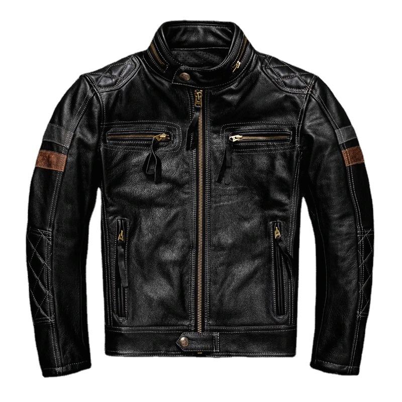 Men's New Pro Motor Biker Real Leather Jacket Quality Cowhide Coat in Black. Canvas Fabric