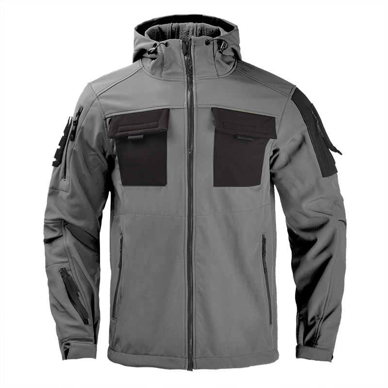 Men's New Style High Quality Softshell Outdoor Jacket Skin Polyester Camo with Stand Collar and Removable Hood for Hunting