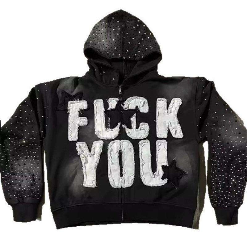 Men's Oversized Zipper-Up Fleece 100% Cotton Streetwear Hoodie Pocket Rhinestone Embellishments Washed Faded Black No Drawstring