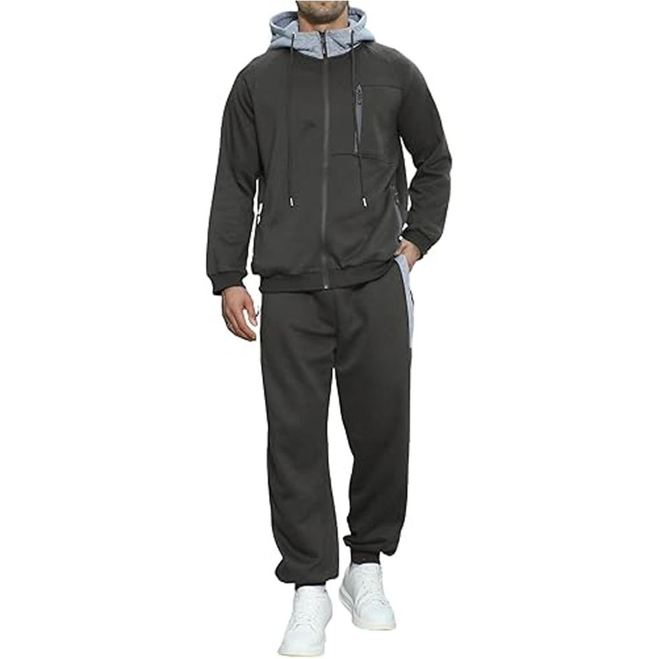 Men’s Performance Slate Grey Tech Tracksuit – Premium Two-Piece Athletic Set Featuring Full-Zip Hybrid Hooded Jacket