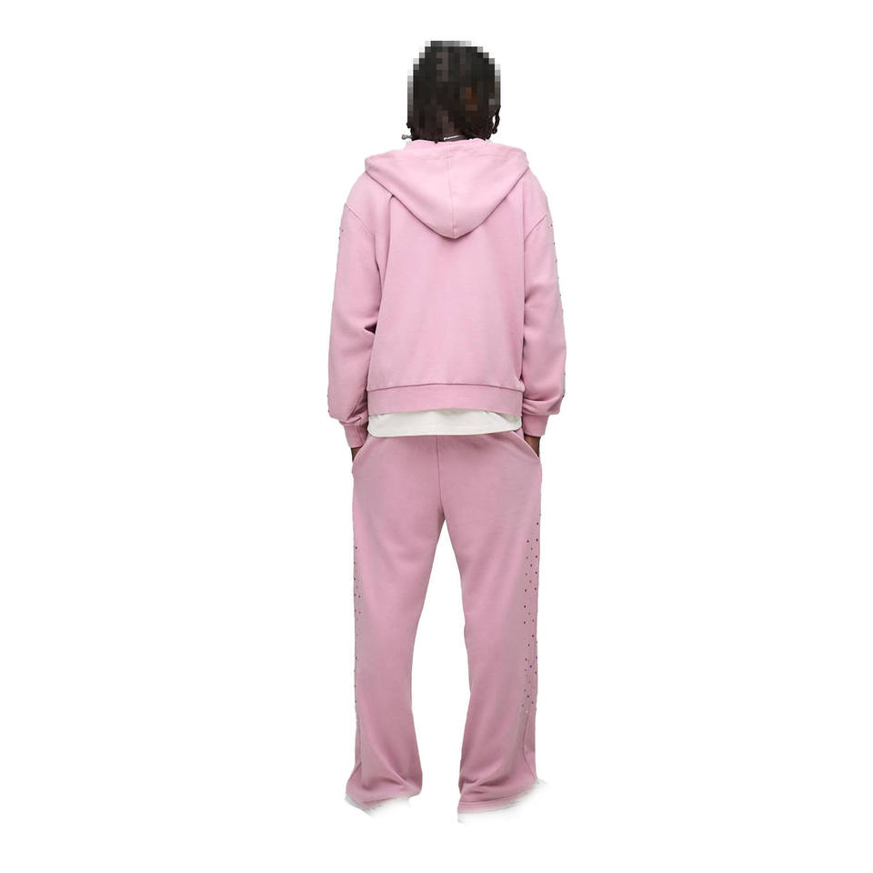 Men's Pink Fleece Hoodie Jogger Set with Micro Stud Detailing Zip Front Hooded Tracksuit for OEM Wholesale