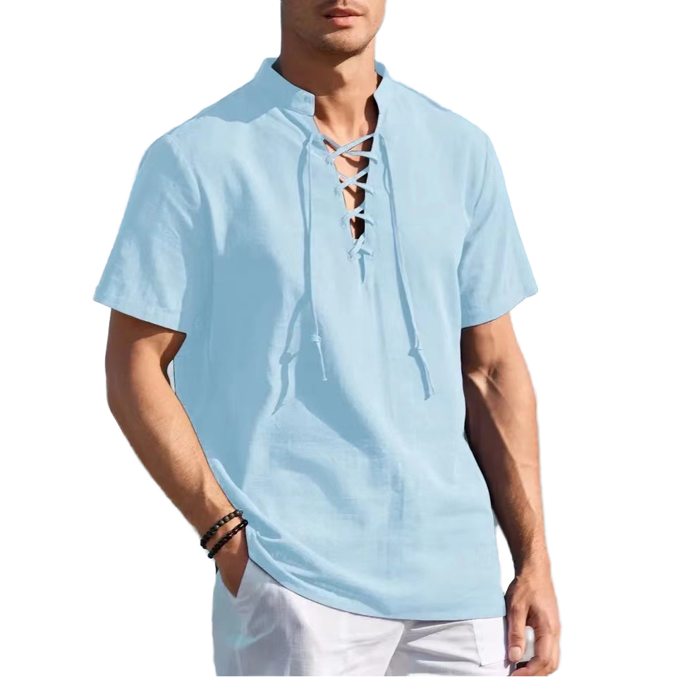 Men s Plus Size Casual Short-Sleeved Cotton and Linen Shirt New Summer Stand Collar Design with European Size for Beach Wear