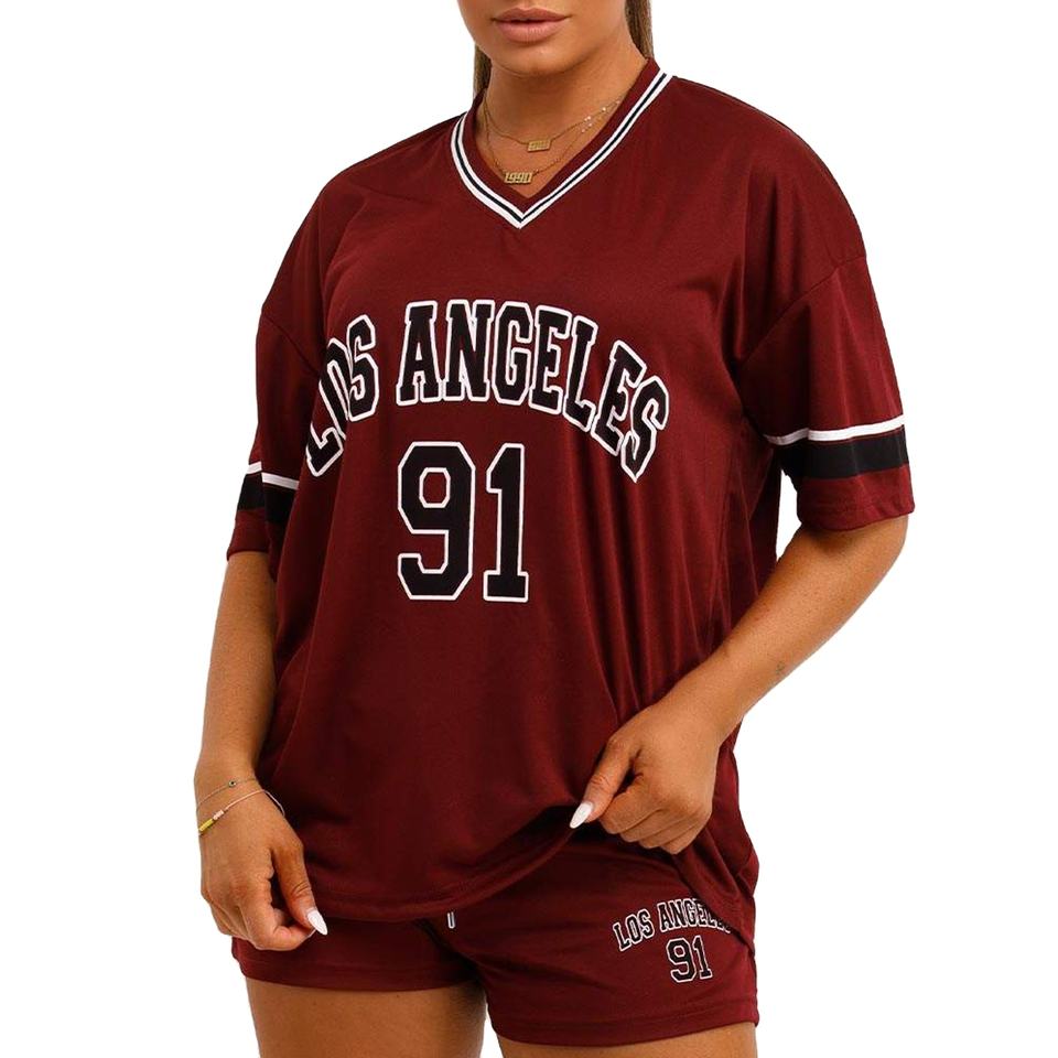 Men's Plus Size Oversized Maroon Two Piece Set American Football Jersey Top Number 91 Print Matching Shorts Streetwear Outfit