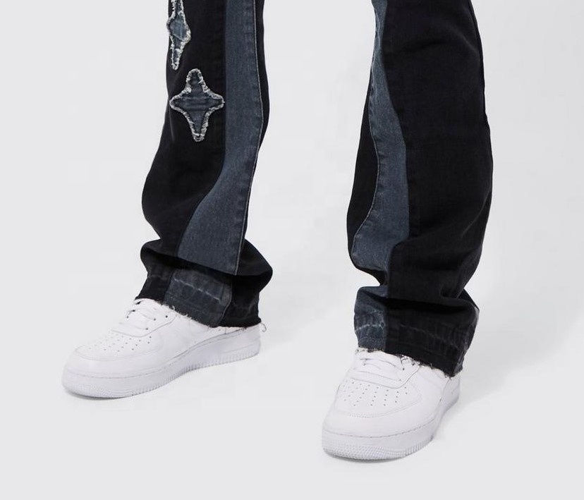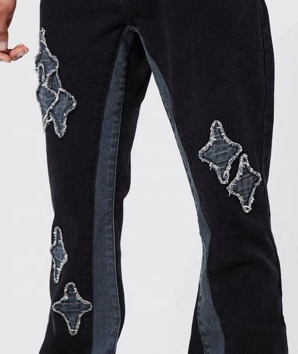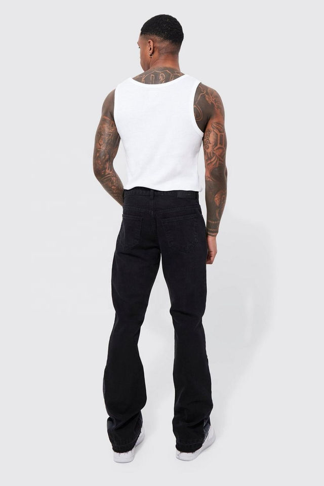 Men's Premium Quality Slim Flare Jeans Winter Stylish Streetwear Breathable Washed Black Applique Panel Stacked Gusset Winter
