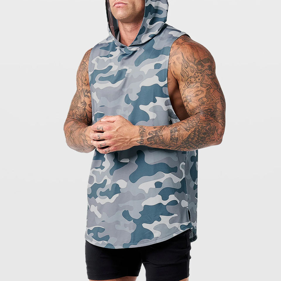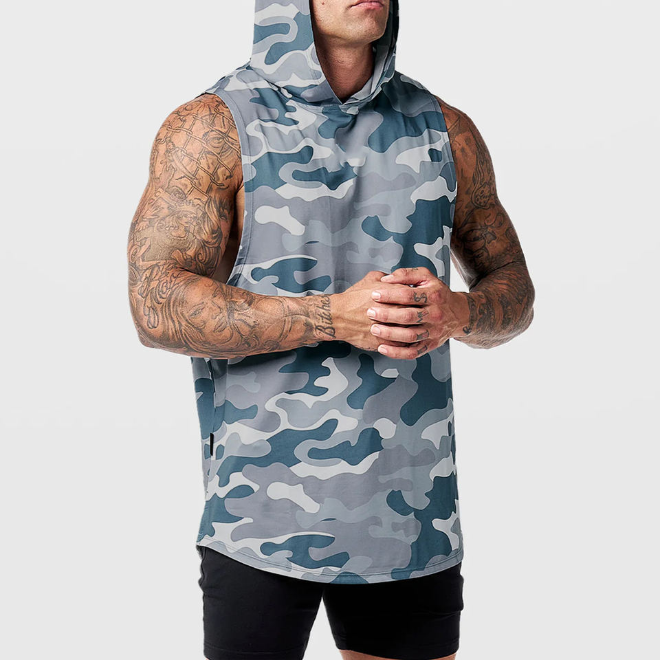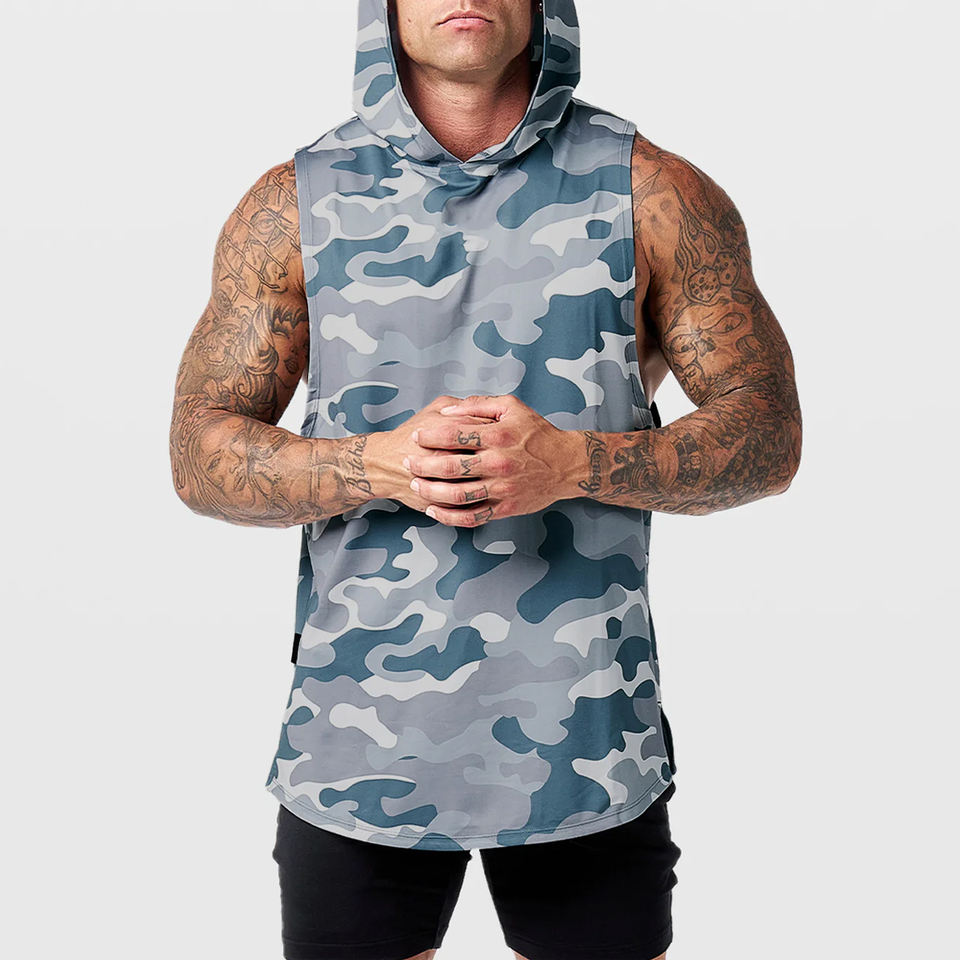 Men's Quick Dry Fitness Gym Hoodie T Shirt Vest Breathable Knitted Sporty Hooded Muscle Tank Top Active Top Men Activewear