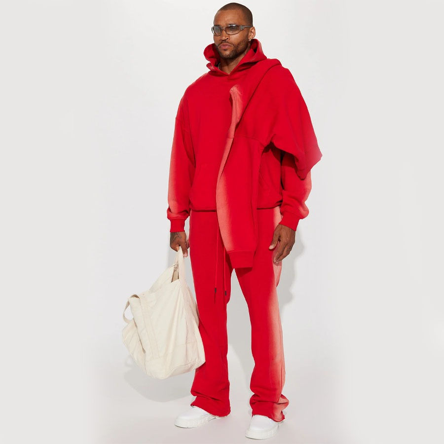 Men's Red Acid Wash Stacked Trousers Sun Faded Paneled Flared Sweatpants Thick Fleece Anti-Wrinkle Plain Dyed Canvas Nonwoven