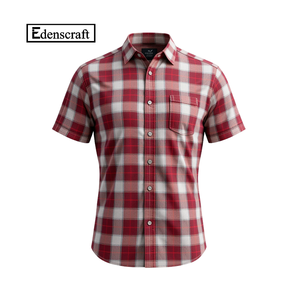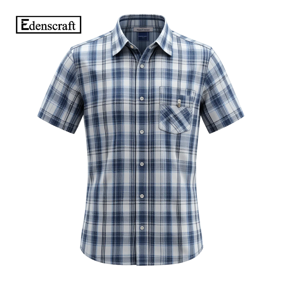 Men's Short Sleeve White Plaid Casual Shirt Poplin Fabric with Chest Pocket Spring Streetwear Style Eco-Friendly Quick Dry