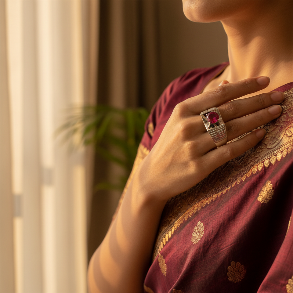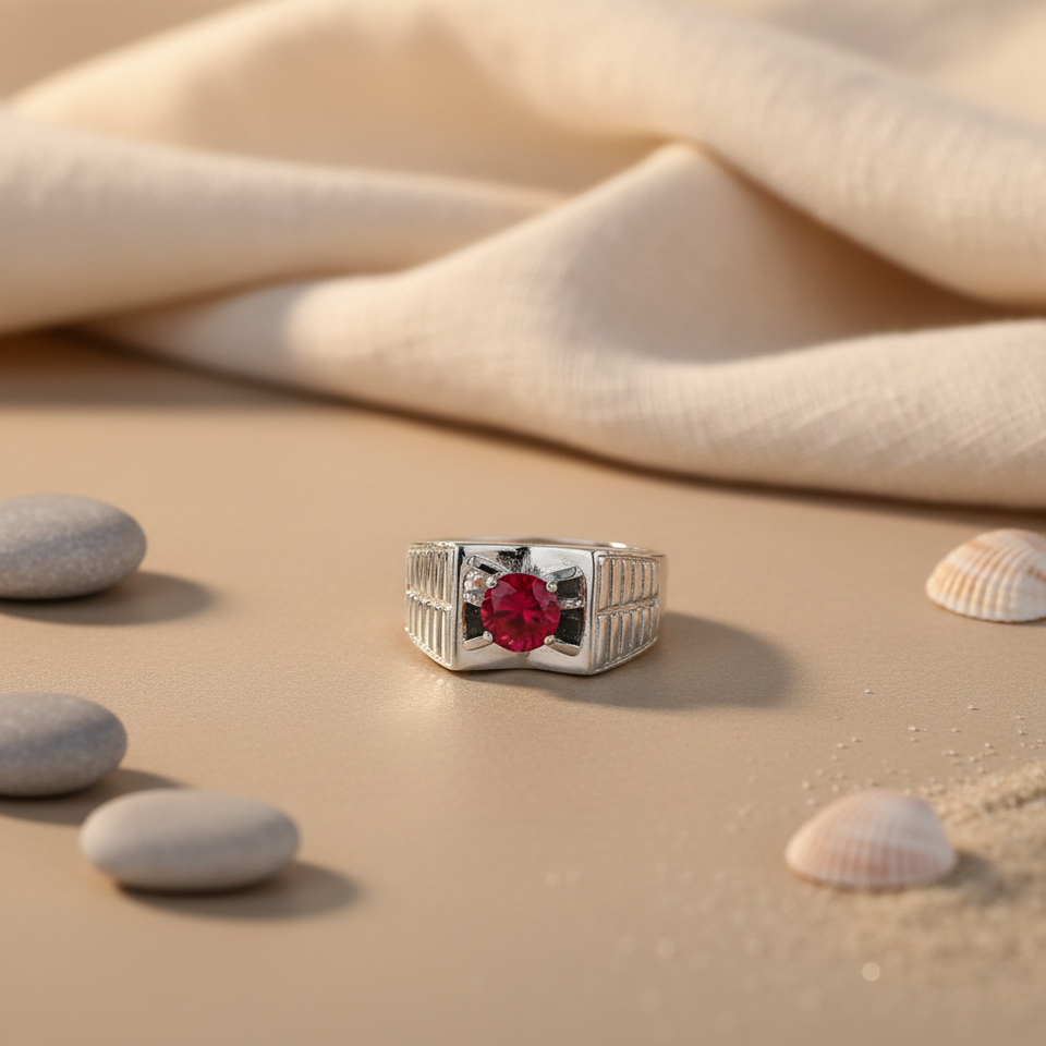 Men's Silver Ruby Ring Geometric Marquise Cut Fine Jewelry with Genuine Ruby Stone IGI Certified Rhodium Plated and Set