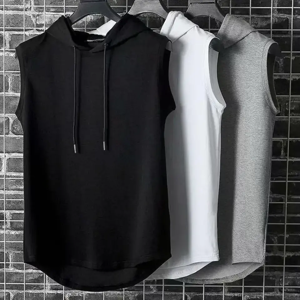 Men's Sleeveless Workout Gym Tank Top Hip Hop Style Hood Collar Made Polyester Cotton Spandex Fitness Mesh Quick Dry Shirt
