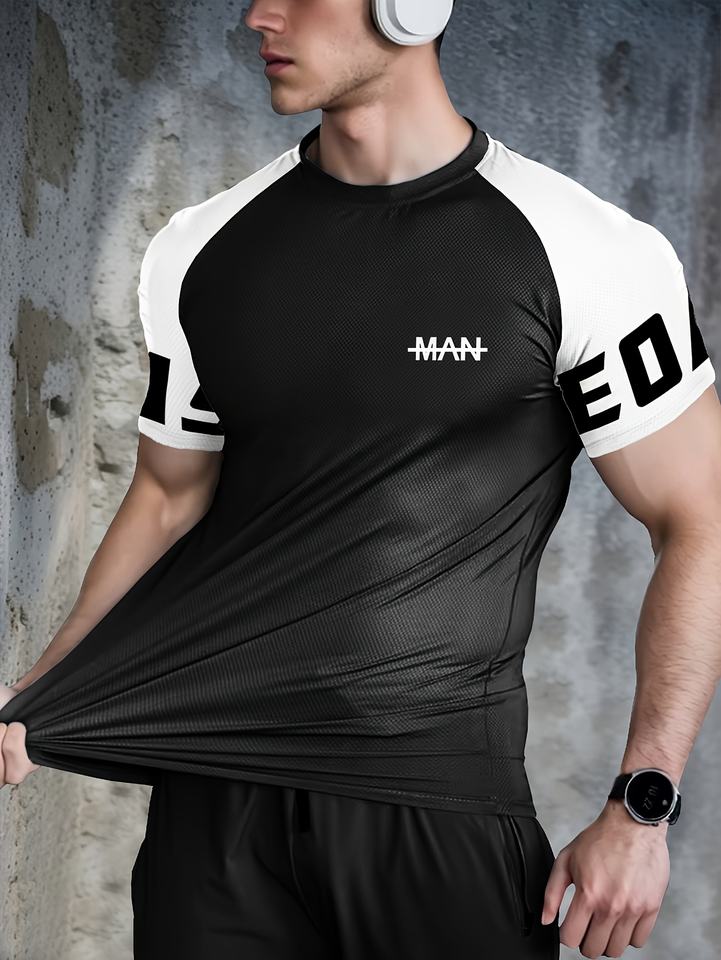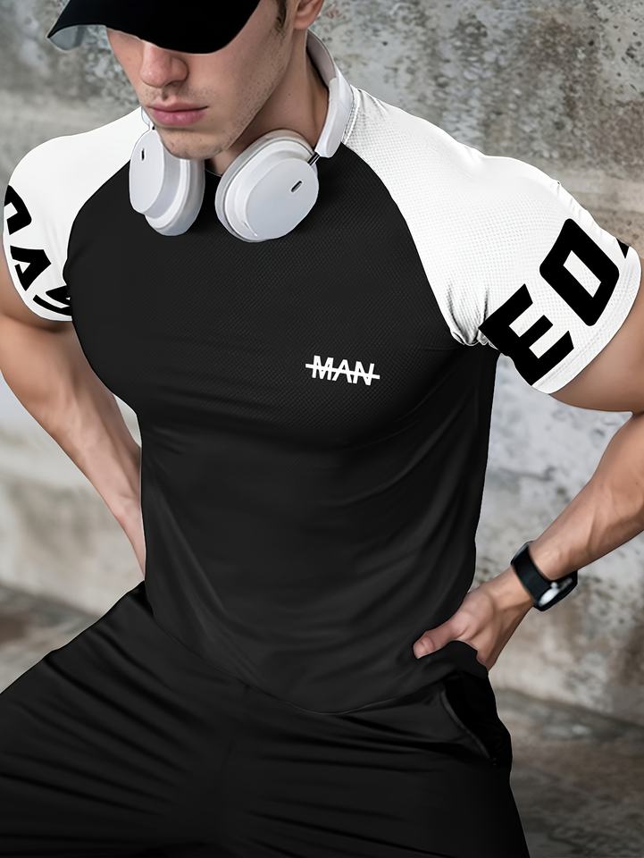 Men's Slim Fit Summer Gym Workout Top Sporty Casual Quick-Dry Breathable Mesh T-Shirt Contrast Black White Printed Casual