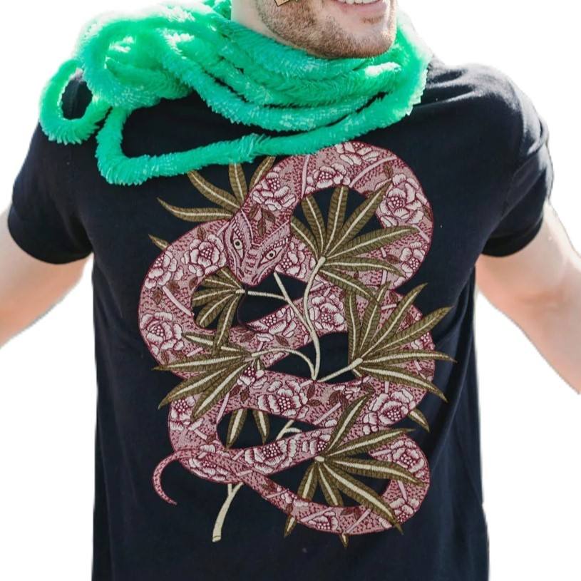 Men’s Snake Embroidered T-Shirt – Stylish Black Cotton Tee with Red Snake and Leaf Design, Trendy Streetwear Fashion Top
