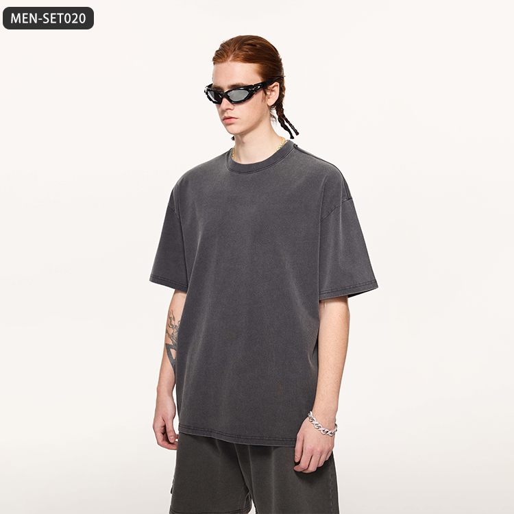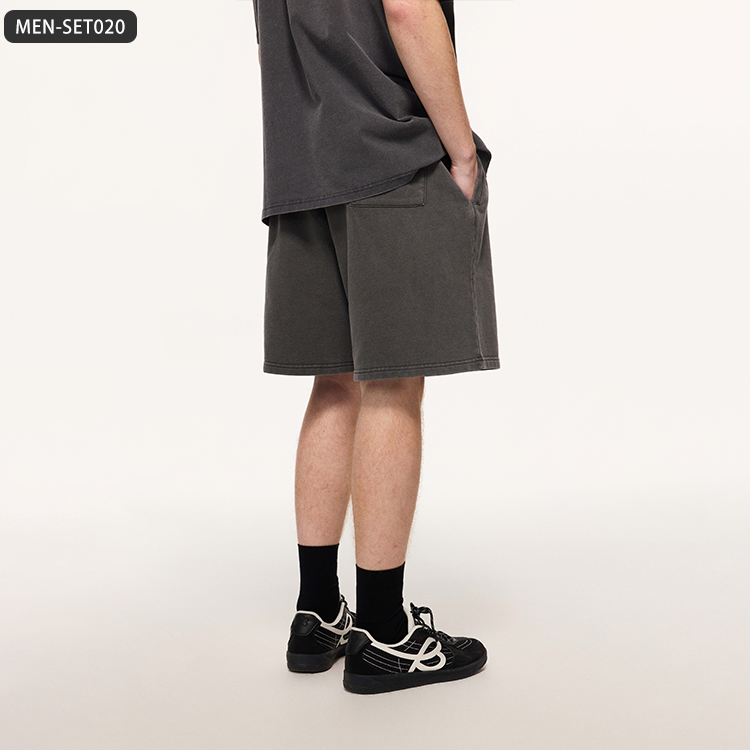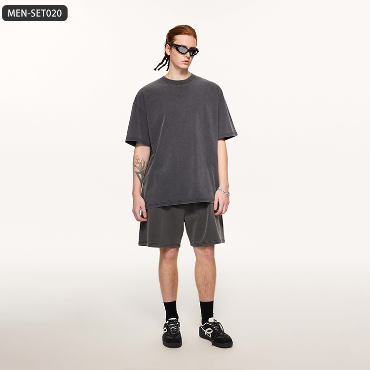 Men's Snow Wash Cotton T-Shirt & Shorts Set - 250g Vintage Washed Two-Piece Outfit, Distressed American Retro Streetwear