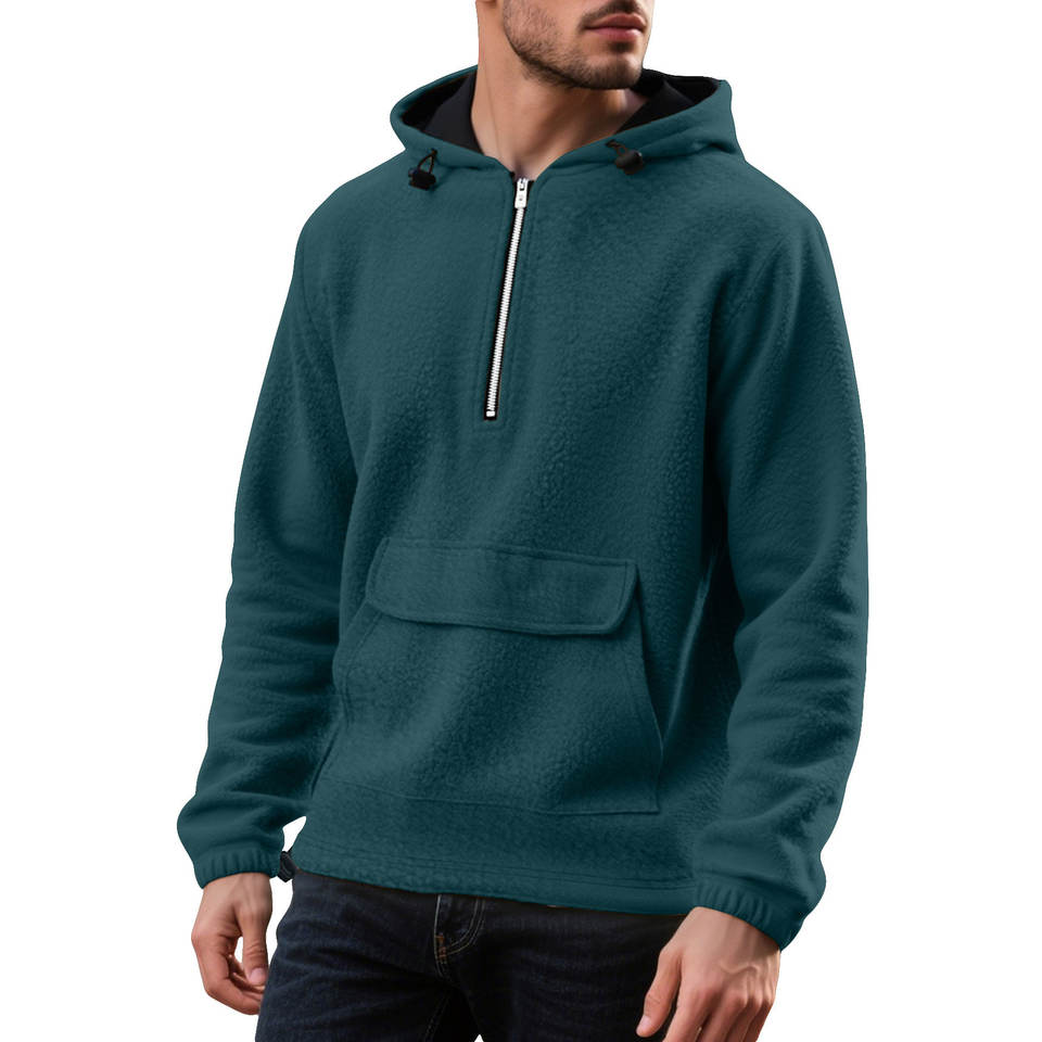 Men's Solid Color High Quality Hoodie Thickened Fleece Lined Half Zip Cargo Pocket Pullover