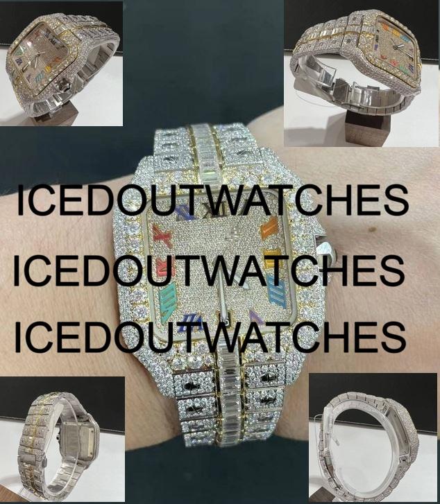 Men's Square Case Stainless Steel & Moissanite Band Iced Out Watch Bracelet Clasp 10 Bar Water Resistance Glass Dial