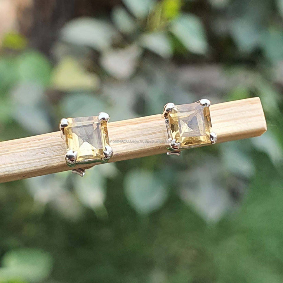 Men's Square Cut Citrine Stud Earrings November Birthstone for Wedding Anniversaries Parties Golden Citrine Sterling Silver Gift